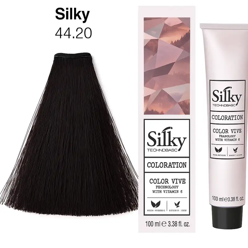 Silky Techno Fiolet to farba do włosów o intensywnym i głębokim odcieniu, który przyciąga spojrzenia i dodaje fryzurze artystycznego wyrazu. Zapewnia pełne krycie siwych włosów, trwałość pigmentu i lśniące wykończenie. Pielęgnująca formuła chroni włosy przed zniszczeniem, pozostawiając je miękkie, sprężyste i pełne koloru. Idealna do użytku profesjonalnego i domowego.